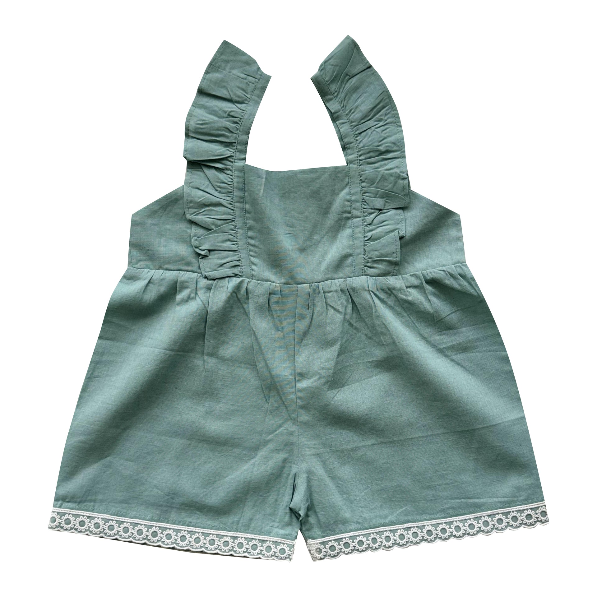 The Playful Powder Blue Jumpsuit is a fun and stylish outfit for little ones! Made from a comfortable cotton-blend linen in a soft powder blue, this jumpsuit is perfect for warm weather adventures. With shorts for easy movement, it’s anything but plain—ruffles and lace details add a delightful touch, bringing charm and personality to the design. This jumpsuit combines playful elegance with everyday comfort, making it an ideal choice for any sunny day outing!