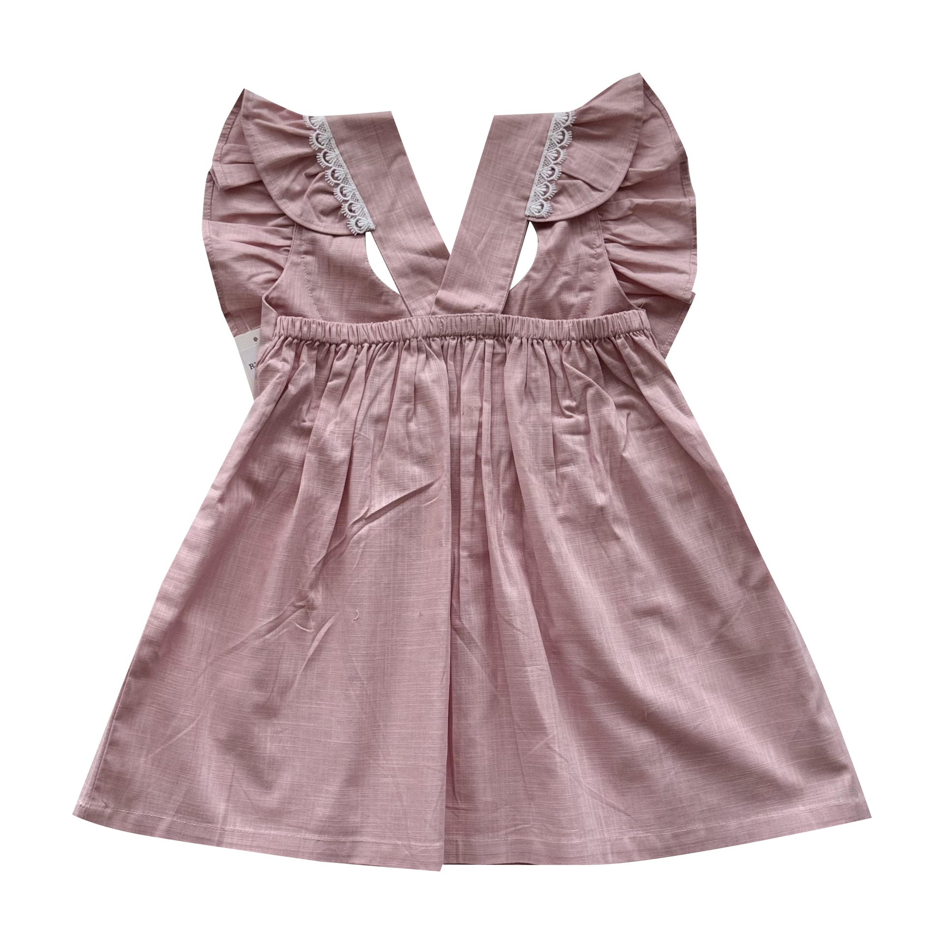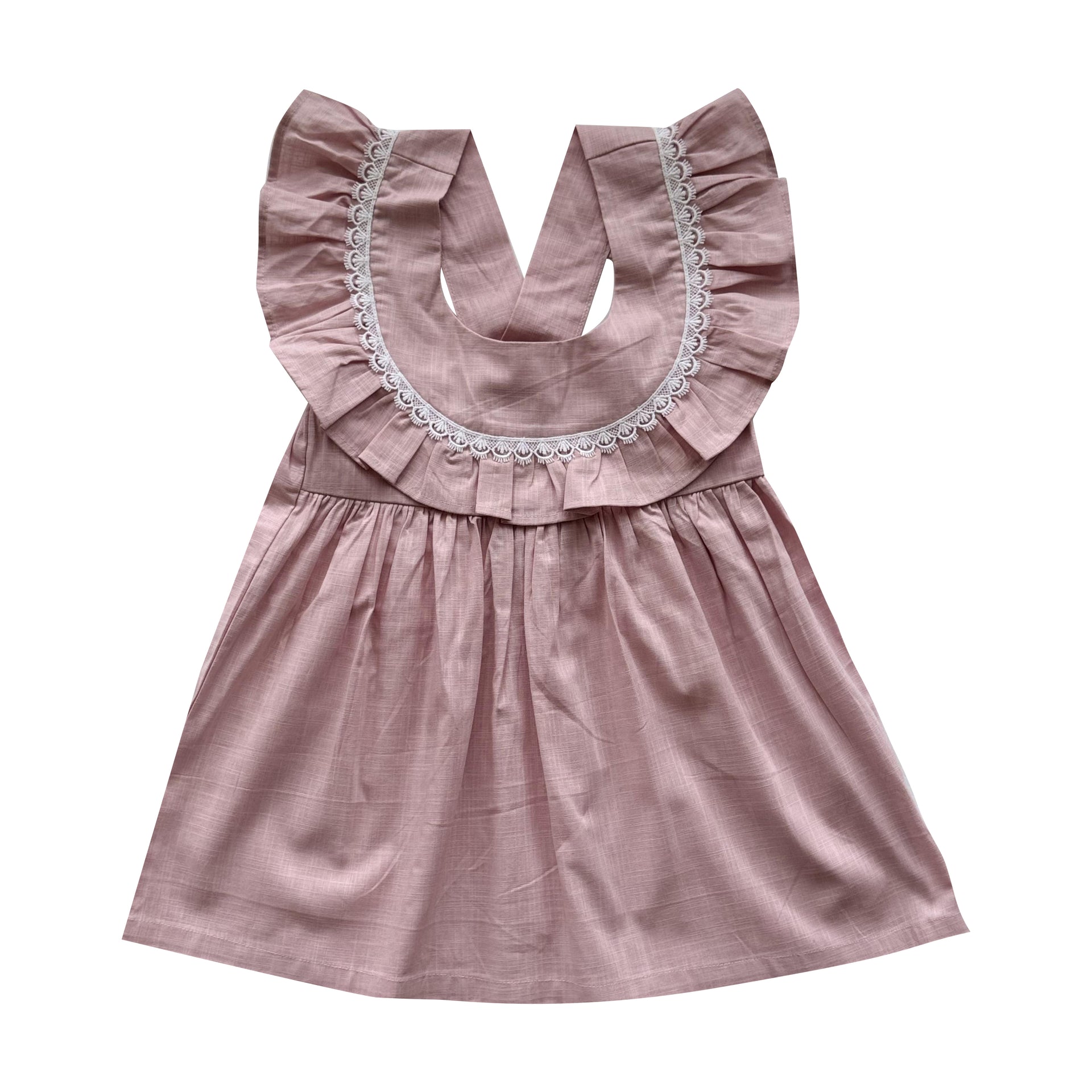 The *Ruffle Bodice Dress* is a charming pinafore-style dress made from a soft cotton-blend linen fabric. In a sweet pink color, this dress is both fun and versatile, perfect for layering during cooler days or wearing on its own in warmer weather. The white lace detailing adds a delicate touch, enhancing its playful yet stylish look. Whether paired with a T-shirt underneath for extra warmth or worn solo for sunny days, this dress is a delightful wardrobe staple for any little one.