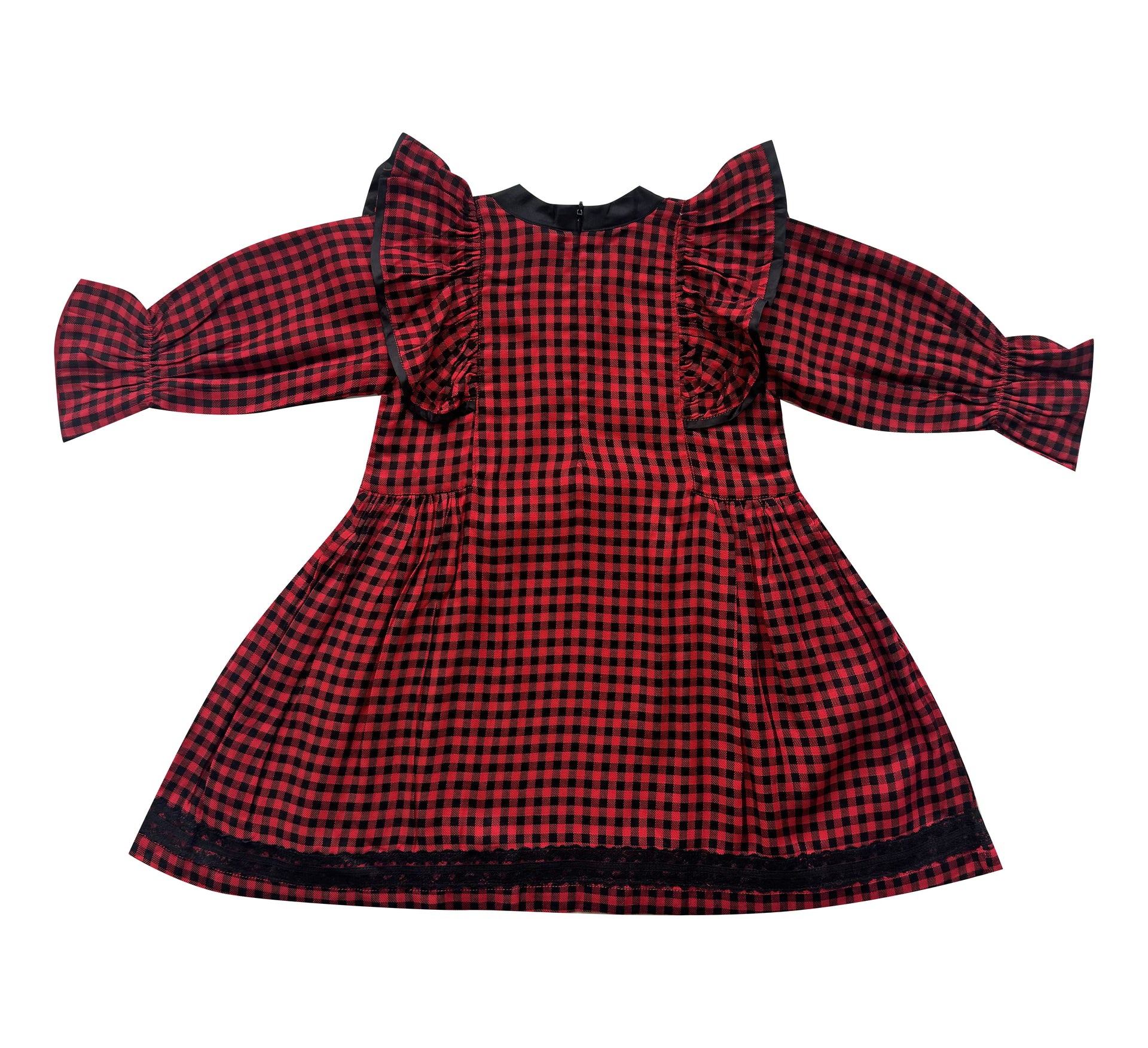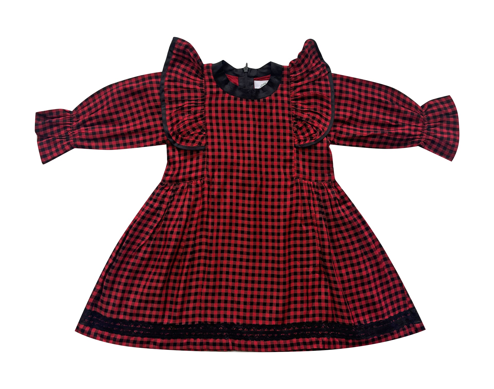 The *Lara Plaid Flowy Dress* takes the same classic black and red plaid design and elevates it with a lightweight, flowy fabric for a softer, breezier feel. It retains the charming ruffles on the shoulders and bodice, with black trim for a polished look. This dress combines the timeless appeal of plaid with a comfortable, flowing silhouette, making it perfect for both casual outings and special occasions. It's a beautiful blend of style and ease, perfect for little ones who love to move and twirl!