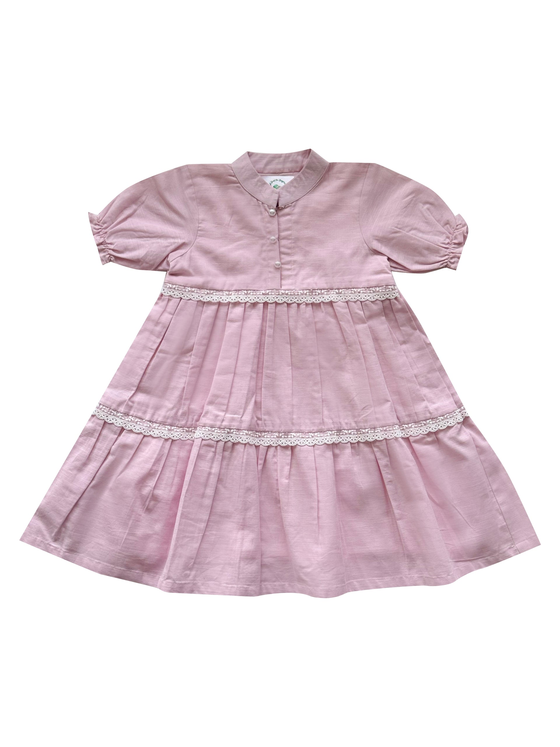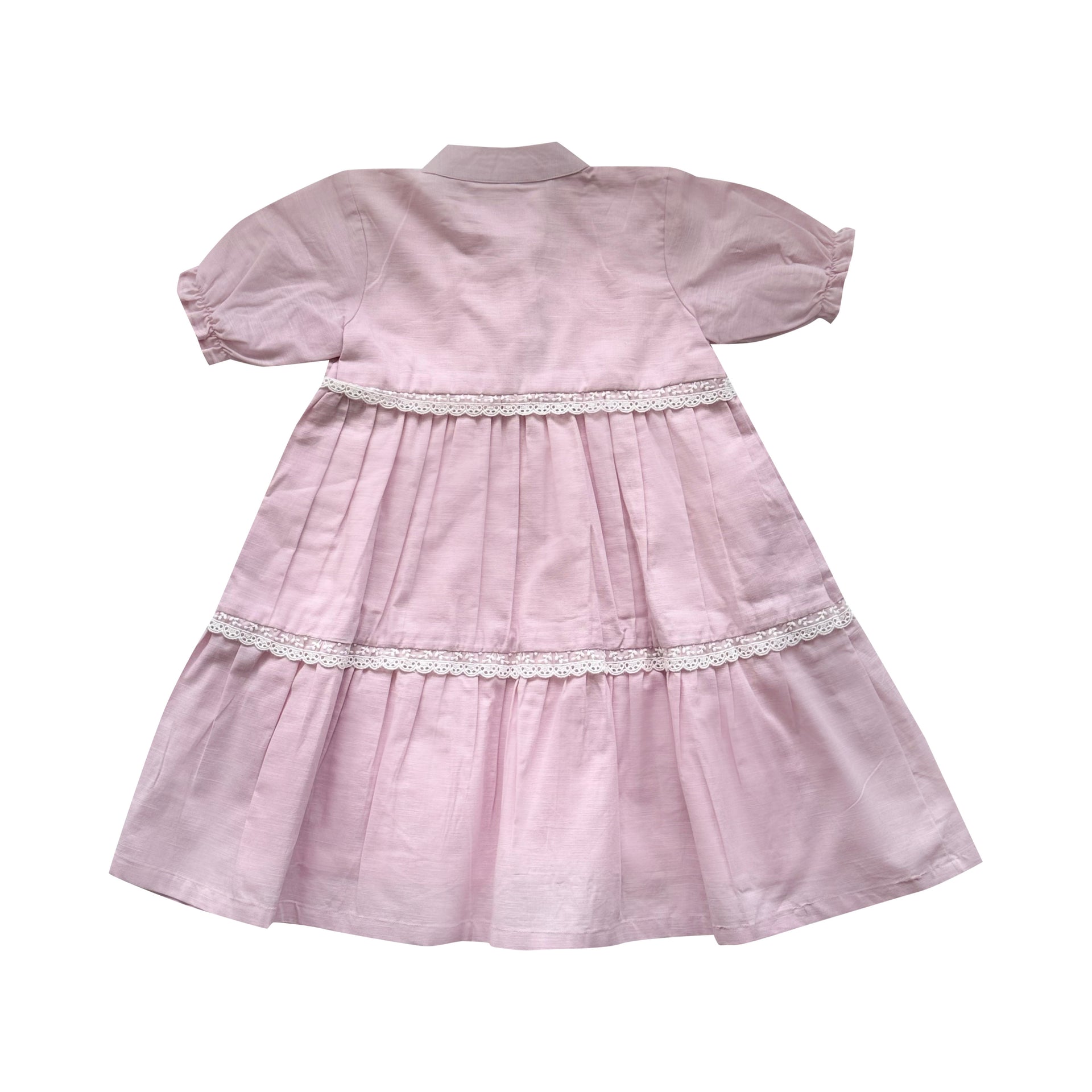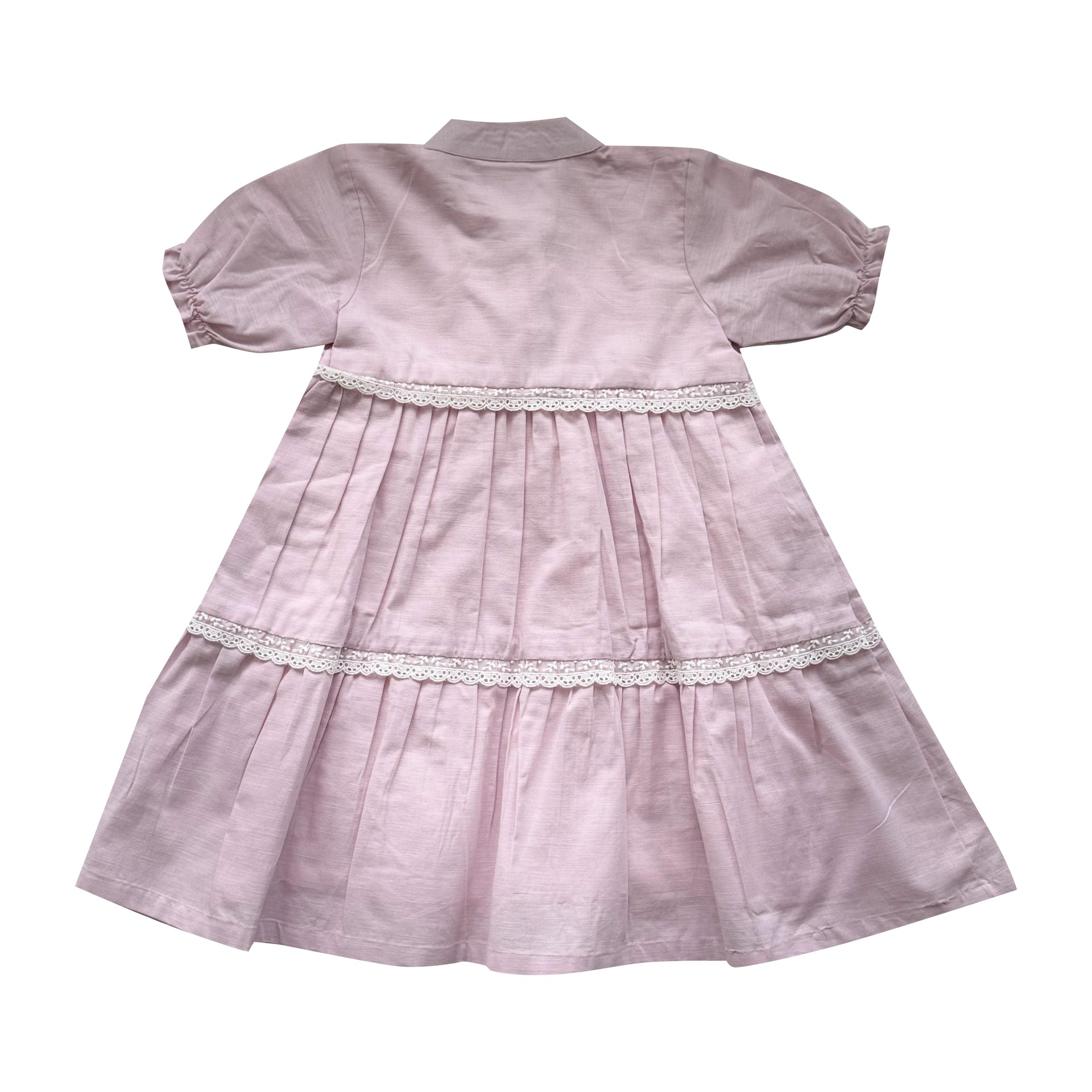This lovely lavender dress is crafted from a soft cotton-blend linen fabric, providing both comfort and durability. Fully lined for a smooth feel, this tiered dress flows beautifully with each layer, adding a graceful movement to every step. Delicate lace inserts between the tiers enhance its elegant, timeless look, making it perfect for any occasion, from family gatherings to special celebrations. The breathable fabric and relaxed fit ensure that it’s as comfortable as it is stylish, making it an effortlessly charming choice for little ones.