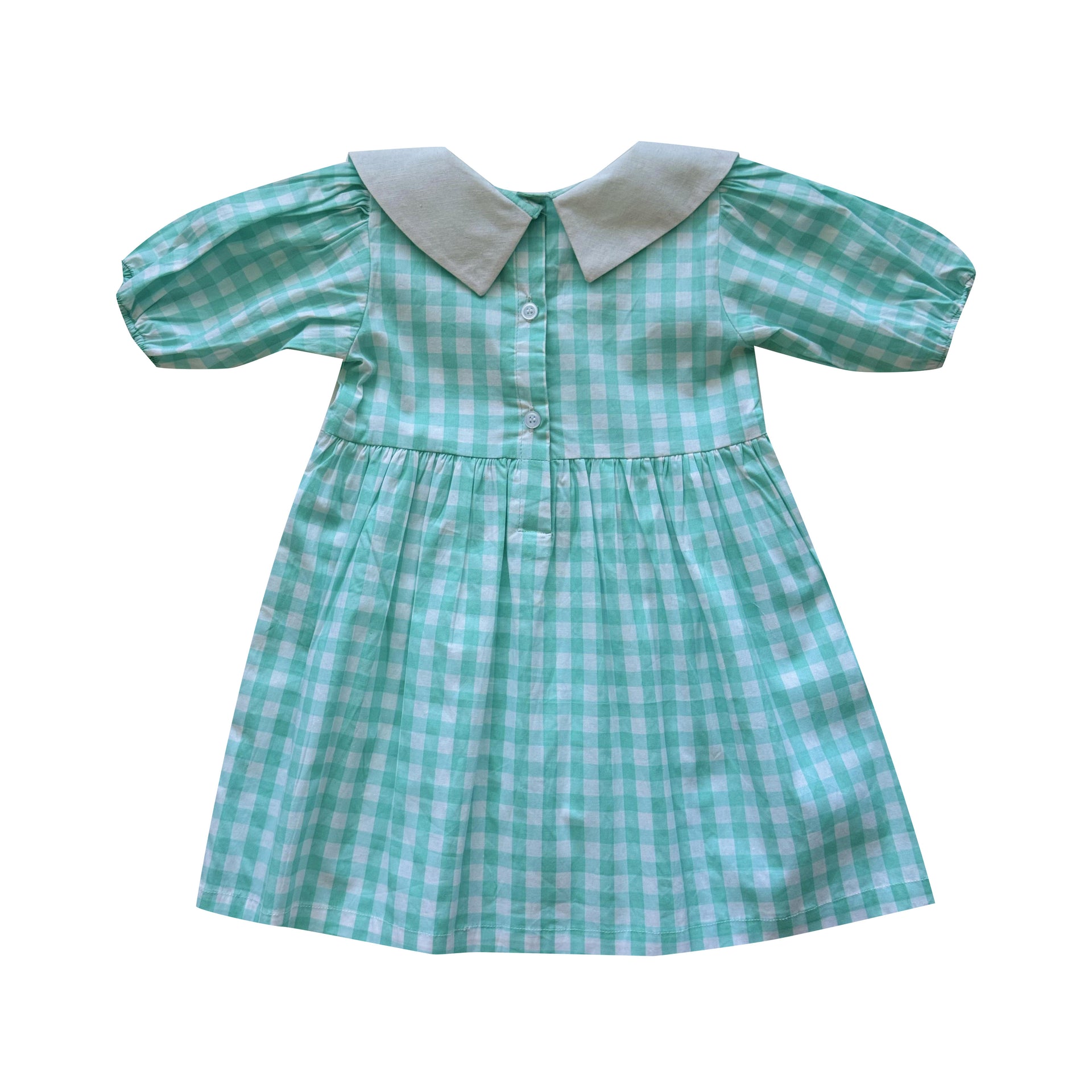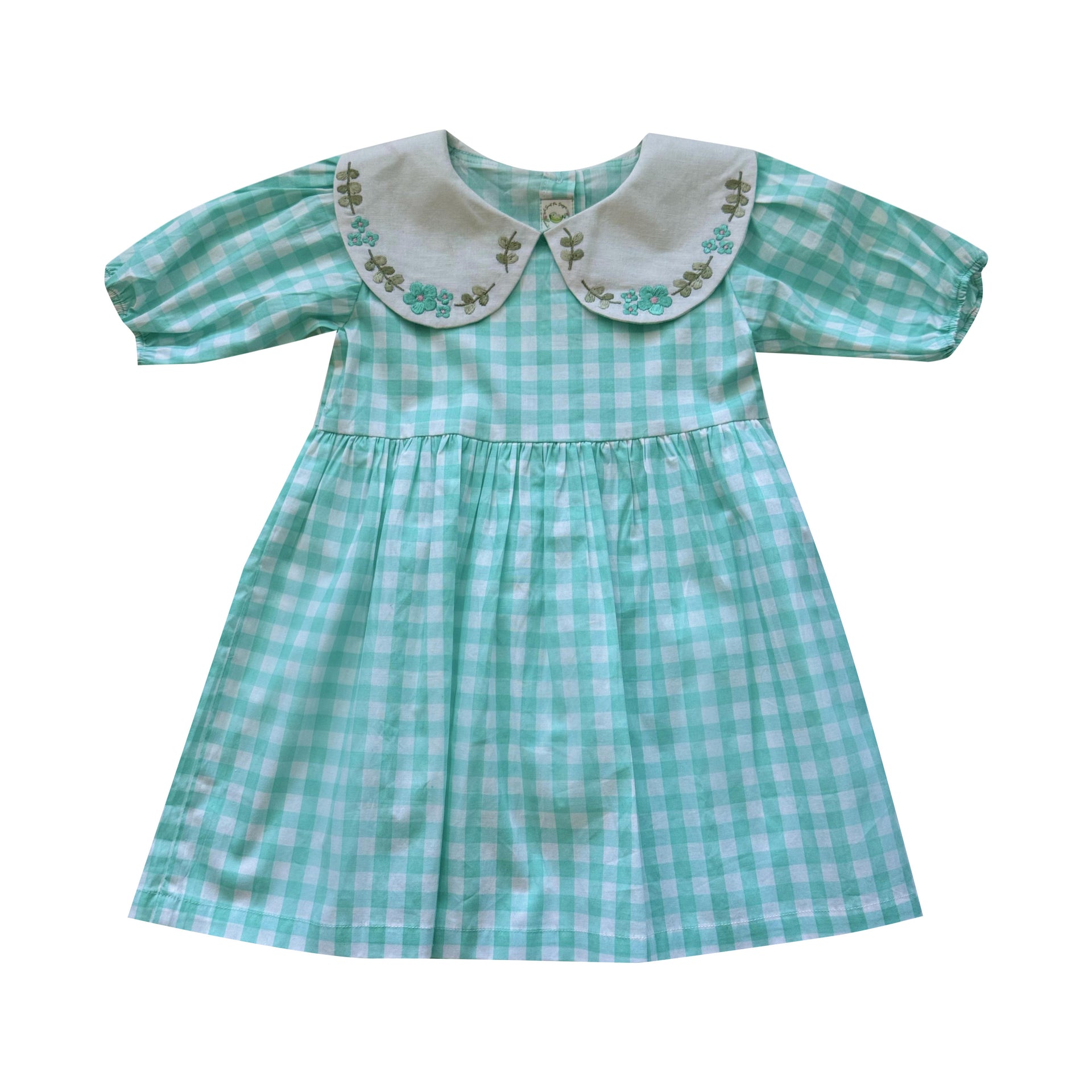 The *Olive Gingham Dress* is an absolutely adorable piece made from mint green plaid, featuring a classic Peter Pan collar beautifully finished with delicate embroidery. The short puff sleeves add a playful touch, while the flared skirt bottom gives the dress a fun, twirl-worthy look. Perfect for family photos or outings, it pairs wonderfully with the *Olive Gingham Boys Shirt*, making it an ideal matching sibling set for brother and sister. It’s a charming, coordinated outfit that combines sweetness and style!